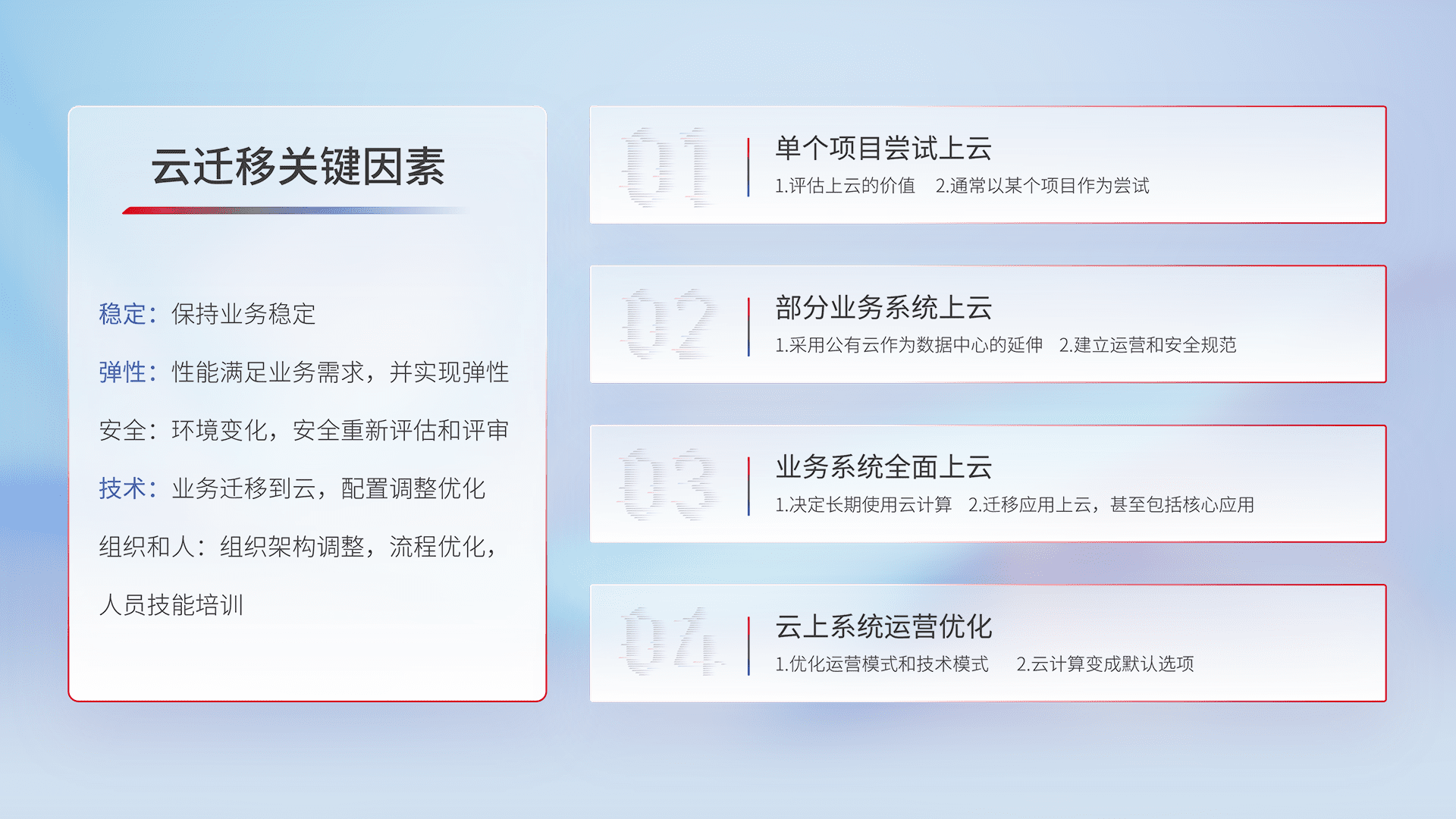 结合实际业务,,,从规划设计、、、、云平台选型、、、、云原生改造、、数据迁移、、集成交付,,,迁移全过程为客户识别最佳上云路径,,,做好风险识别管理,,,,设计网络架构、、身份权限、、、安全审计合规、、、、操作审计、、、日志审计、、、监控告警策略、、、、多站点容灾设计等,,,,对云上基础设施进行整体规划,,,提升IT治理水平,,以满足弹性、、、高可用、、、、高性能的需求。。