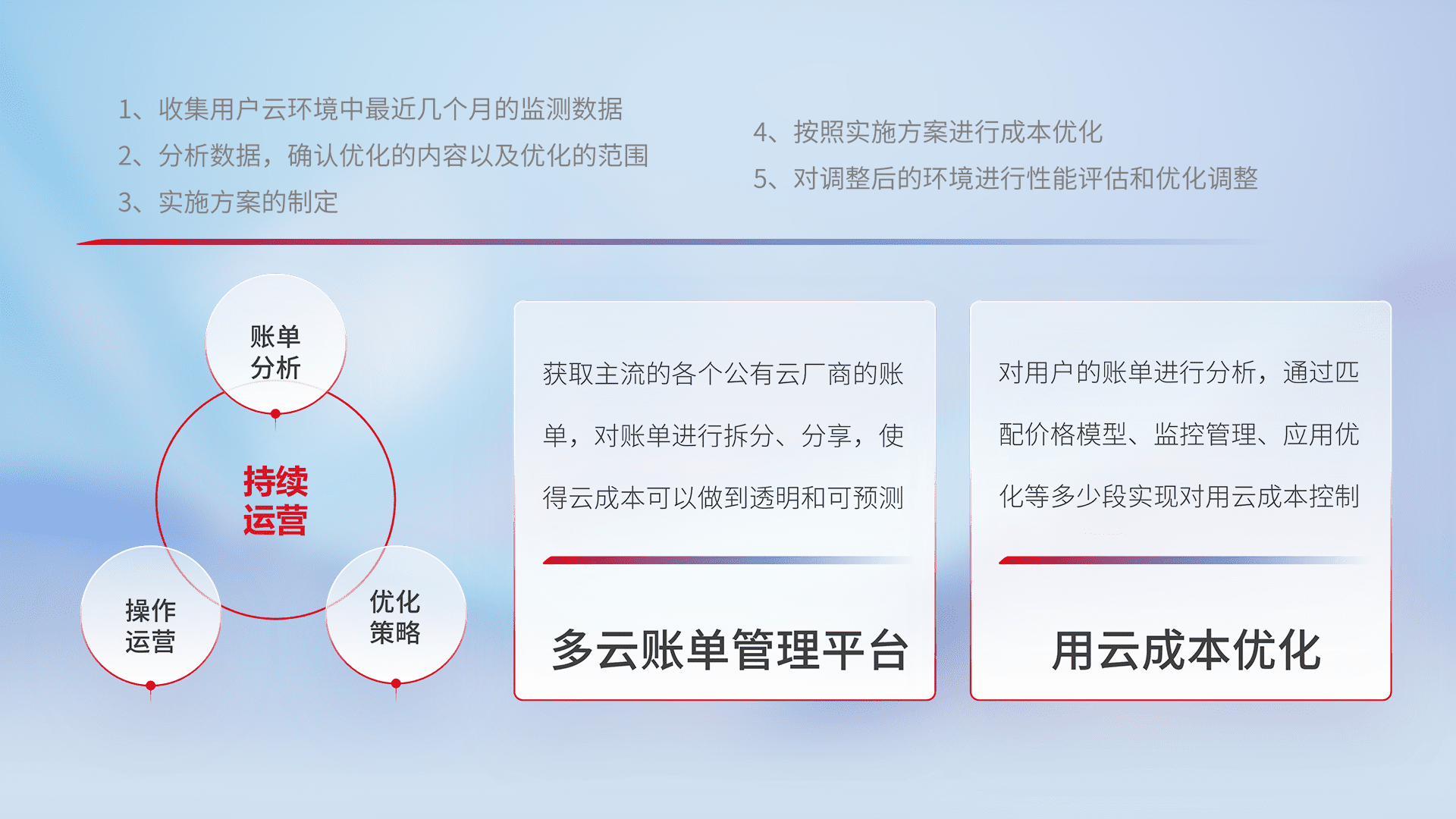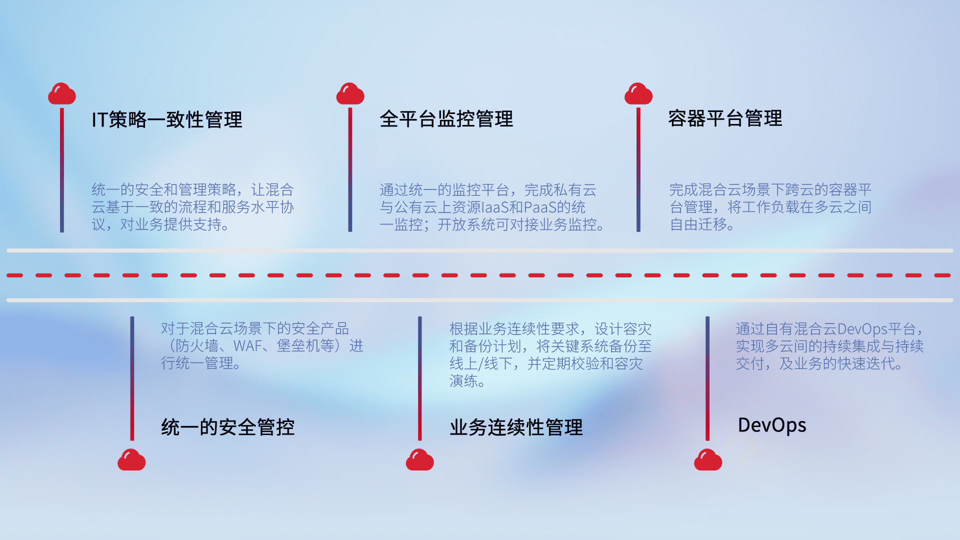 通过多云纳管,,,以统一的资源数据模型把客户的云资源进行抽象和封装,,进而实现对多云资源的统一操作,,,保障云资源管理的可靠性、、、稳定性与可用性。。量身定制化运维内容,,,配置、、、、开发运维、、、、补丁管理、、、备份、、、监控、、、认证和访问管理、、审计和日常巡检等,,,保障在用云过程中的可靠度,,,,稳定度以及高可用率。。